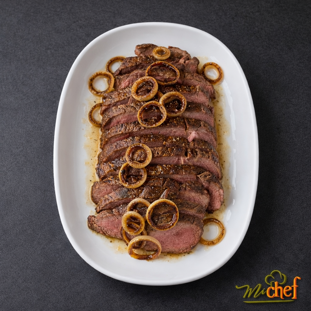 Filé mignon cortado em tiras macias e selado no ponto certo, finalizado com cebolas douradas lentamente. Um prato clássico, sabor intenso e textura extremamente macia, feito para quem busca carne nobre sem complicação.