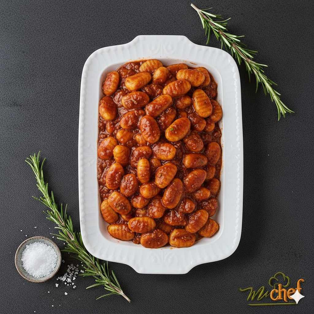 Gnocchi de batata doce preparado artesanalmente, com textura macia e sabor equilibrado. Cada unidade é recheada com provolone derretido e finalizada com molho bolonhesa encorpado, feito a partir de carne selecionada e tomates cuidadosamente preparados.