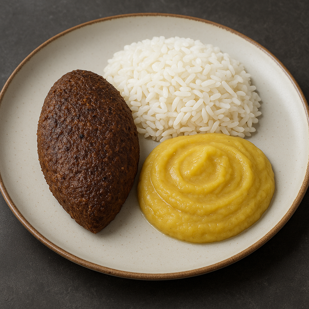 Confira abaixo os itens que compõem esse prato. Não é possível alterar a composição. Você pode montar seus pratos como desejar, escolhendo os seus itens no nosso menu " Porções" Quibes de carne e queijo (120G) Purê de banana da terra (100g) Arroz Branco (120g)